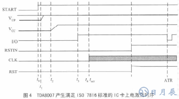 圖4為IC卡的上電時(shí)序圖。要實(shí)現(xiàn)之,需對(duì)PCR進(jìn)行寫操作。其中START=PCR.0,RSTIN=PCR.2,VUP上升表示激活了TDA8007中的電壓轉(zhuǎn)換電路。當(dāng)START置高時(shí),只要能檢測到選定卡槽中的IC卡存在,且沒有TDA8007能檢測到并在HSR中指示的硬件錯(cuò)誤出現(xiàn),則對(duì)應(yīng)IC卡接口的VCC1或VCC2將能被提供響應(yīng)的電平(5V、3V或1.8V)。隨后對(duì)應(yīng)卡的I/O數(shù)據(jù)線被置成高狀態(tài)(Z狀態(tài)),給IC卡提供設(shè)定的時(shí)鐘信號(hào),常用為3.5712MHz。大約在START置高108ETU后,RSTIN置高。因?yàn)镽ST為RSTIN的拷貝,則對(duì)應(yīng)卡的RST被置高。然后,用TDA8007提供的定時(shí)器TOR3、TOR2設(shè)定對(duì)ATR(Answer To Request)即復(fù)位應(yīng)答首字節(jié)的最大等待時(shí)間120ETU(Element Time Unit),TOC設(shè)定定時(shí)器工作方式,便開始等待ATR首字節(jié)到來后做相應(yīng)處理。至此,IC卡上電激活工作完成,隨后可以根據(jù)ATR字節(jié)的要求的工作方式對(duì)IC卡進(jìn)行相應(yīng)的讀寫處理。具體見上電程序。