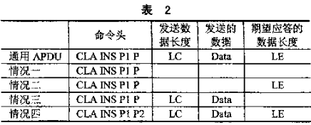 應(yīng)用層即為由CLA、INS、P1、P2、P3作為命令頭組成的命令消息體的APDU響應(yīng)和應(yīng)答處理層。其中CLA為指令類別,INS為指令碼,P1、P2為參數(shù),P3為根據(jù)APDU的不同格式為發(fā)送給卡的數(shù)據(jù)長度或期望響應(yīng)的數(shù)據(jù)長度。APDU的幾種情況如表2所列。
