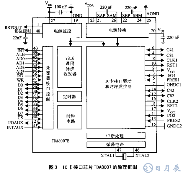 下面介紹一下TDA8007及其應(yīng)用。TDA8007的原理結(jié)構(gòu)如圖3所示。