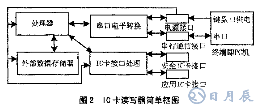 圖2所示為通過PC機(jī)控制管理的外置于PC機(jī)的接觸式CPU IC卡讀寫器。通過定制的數(shù)據(jù)線,該讀寫器的5V直流電源可直接由鍵盤口提供,同時(shí)數(shù)據(jù)線還負(fù)責(zé)PC機(jī)與讀寫器的串行數(shù)據(jù)交換。在大部分IC卡讀寫應(yīng)用中,都涉及到IC卡的認(rèn)證和數(shù)據(jù)讀寫的國解密問題,所以本讀寫器除了提供一個(gè)供用戶使用的IC卡接口卡座外,還內(nèi)置了一個(gè)SAM卡,即安全I(xiàn)C卡卡座,以方便安裝SAM卡,保證應(yīng)用IC卡讀寫時(shí)的數(shù)據(jù)安全,保護(hù)用戶的利益。