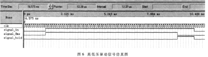 在FPGA中雖然沒有單穩(wěn)態(tài)電路,但是可以采用時鐘計數(shù)的方式來模擬單穩(wěn)態(tài)的產(chǎn)生:在信號的上升沿開始計數(shù)并設(shè)置單穩(wěn)態(tài)信號有效,計滿8 ms的時鐘脈沖個數(shù)后停止計數(shù)并設(shè)置單穩(wěn)態(tài)信號無效,這樣就可以輸出精確的8 ms單穩(wěn)態(tài)信號。例如,假設(shè)采用8 k的計數(shù)時鐘頻率,64個計數(shù)時鐘周期就是8 ms,單穩(wěn)態(tài)信號的誤差不會超過0.125 ms,高低壓驅(qū)動信號仿真圖如圖6所示,其中signal_8ms為8 ms單穩(wěn)態(tài)驅(qū)動信號,signal_hold為低壓驅(qū)動信號。