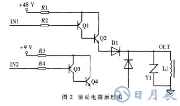 驅(qū)動電路采用雙電壓方式,其原理圖如圖2所示。輸入信號IN1是8 ms的單穩(wěn)態(tài)信號,控制48 V電源打開電磁閥;輸入信號IN2是引緯的保持信號,控制9 V的電源以保持電磁閥的打開狀態(tài);為了保證足夠的驅(qū)動能力,兩路信號的驅(qū)動三極管都采用達林頓方式;雙二極管D1是為了防止電源切換時48 V電源串接到9 V電源中;L1為引緯電磁閥,由于電磁閥為感性器件,在電磁閥關(guān)斷時OUT端因電感的儲能特性會出現(xiàn)一個比較高的負(fù)壓,若產(chǎn)生的負(fù)壓高于Q2和Q4三極管的最大承受電壓,則可能會損壞Q2和Q4三極管。這里的亞敏電阻Y1就是消減過高負(fù)壓的保護元件。