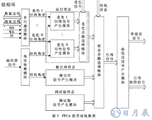 市場上現(xiàn)有的噴氣織機都是由DSP、單片機等處理器產(chǎn)生的。由于處理器的程序是順序執(zhí)行的,如果控制誤差不超過1°,就必須在織機旋轉(zhuǎn)1°的時間內(nèi)計算完成幾十路的引緯信號。也就是說在130 ms內(nèi)完成主程序的一個循環(huán),這種速度對于一般的處理器是很難實現(xiàn)的,特別是在主程序還要完成數(shù)據(jù)的讀取、角度的計算、通信等功能的情況下,對于更高速的織機更是無法實現(xiàn)。因此市場上現(xiàn)有的噴氣織機速度一般都不會超過1 000 r/min,引緯性能也受限于控制的精度、速度和一致性。
