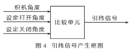 引緯信號由比較單元比較織機角度和設(shè)定打開角度、設(shè)定關(guān)閉角度而產(chǎn)生,引緯信號產(chǎn)生框圖如圖4所示。當(dāng)引緯信號沒有跨越零度時,即設(shè)定關(guān)閉角度大于設(shè)定打開角度時,引緯信號在織機角度大于設(shè)定打開角度且小于設(shè)定關(guān)閉角度時有效;反之,當(dāng)引緯信號跨越零度時,即設(shè)定關(guān)閉角度小于設(shè)定打開角度時,引緯信號在織機角度大于設(shè)定打開角度或小于設(shè)定關(guān)閉角度時有效。