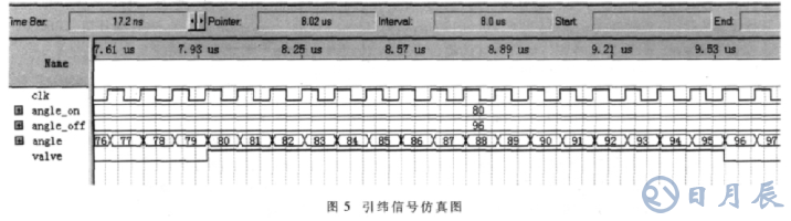 FPGA本質(zhì)上是由硬件組成的,其編程語言也為VHDL等硬件描述語言,它的程序并行執(zhí)行,也就是說一旦主機角度或設(shè)定的打開關(guān)閉角度有變化,幾十路的引緯信號就會立即同時輸出,誤差僅為信號的建立時間,只有幾納秒。因此FPGA產(chǎn)生的引緯信號可以很好地滿足噴氣織機對引緯控制精度和控制一致性的要求,從根本上改變處理器產(chǎn)生引緯信號的弊端。引緯信號仿真圖如圖5所示:設(shè)定打開角度為80°,設(shè)定關(guān)閉角度為96°,引緯信號在這個區(qū)間內(nèi)有效。由圖5可以看出,引緯信號的產(chǎn)生和關(guān)閉幾乎沒有任何延時。