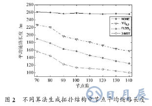 采用YG6,3算法、FLSS3算法以及3-MST算法分別進(jìn)行50次仿真,將生成拓?fù)浣Y(jié)構(gòu)中平均鏈路長(zhǎng)度和未進(jìn)行拓?fù)淇刂频钠骄溌烽L(zhǎng)度進(jìn)行比較,如圖2所示。