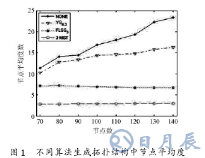 構(gòu)建1 000 m×1 000 m無(wú)線傳感器網(wǎng)絡(luò)仿真區(qū)域,網(wǎng)絡(luò)中隨機(jī)布置監(jiān)測(cè)節(jié)點(diǎn)70~140個(gè)不等,令網(wǎng)絡(luò)中監(jiān)測(cè)節(jié)點(diǎn)最大發(fā)射半徑為400 m,取簇節(jié)點(diǎn)個(gè)數(shù)N=3,首先對(duì)該網(wǎng)絡(luò)進(jìn)行多簇點(diǎn)簡(jiǎn)化,然后分別采用YG6,3算法、FLSS3算法以及本文提出的K-MST算法(K=3)進(jìn)行保證每個(gè)節(jié)點(diǎn)至簇節(jié)點(diǎn)有3條不相關(guān)路徑的拓?fù)淇刂?,?duì)每種算法分別進(jìn)行50次仿真,將所得的節(jié)點(diǎn)平均度數(shù)和未進(jìn)行拓?fù)淇刂乒?jié)點(diǎn)平均度數(shù)進(jìn)行比較,如圖1所示。