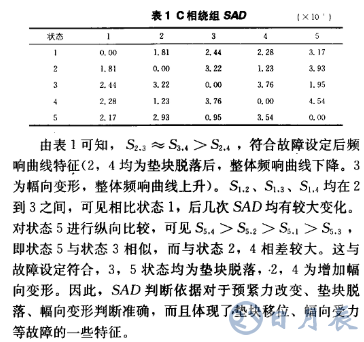 該判據(jù)考察兩組曲線之間的標(biāo)準(zhǔn)偏差。由于計算中使用了偏差的平方和,而對于現(xiàn)在VFRA頻響數(shù)據(jù)的特點(diǎn)(高頻幅值大于低頻)來說該判據(jù)對高頻段考察更為嚴(yán)格。計算C相的SAD變化表見表1。