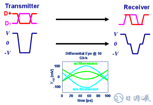 由于玻纖布的相對(duì)介電常數(shù)和環(huán)氧樹脂存在較大差異(環(huán)氧樹脂約為3,玻纖布約為6)。因此板面不同位置的介電常數(shù)存在差異,從而導(dǎo)致板面不同位置阻抗的差異。同時(shí),同一阻抗線,由于位置不同,介電常數(shù)也不均勻。對(duì)于差分對(duì)的影響更為明顯,可能導(dǎo)致眼圖塌陷。