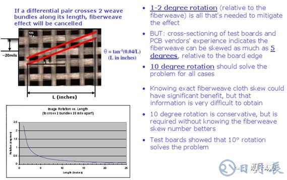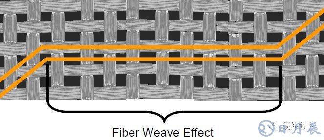 不同的玻纖布,經(jīng)緯紗線的寬度及其間距大小也不一樣,如果按橫平豎直的布線策略,則PCB走線始終與基板邊緣呈0°或者90°,這樣會(huì)導(dǎo)致傳輸線方向與玻纖經(jīng)緯向平行,此時(shí)會(huì)出現(xiàn)幾種情況:傳輸線在經(jīng)向玻纖束正上方,傳輸線在緯向玻纖束正上方,傳輸線在兩根經(jīng)向玻纖束中間,傳輸線在兩根緯向玻纖束中間。