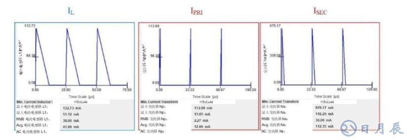 圖4比較了具有相同輸入和輸出規(guī)格的降壓電感器和反激變壓器的一次和二次繞組的電流波形。降壓電感器波形在左側的單個藍色框中,反激的一次繞組和二次繞組在右側的兩個紅色框中。