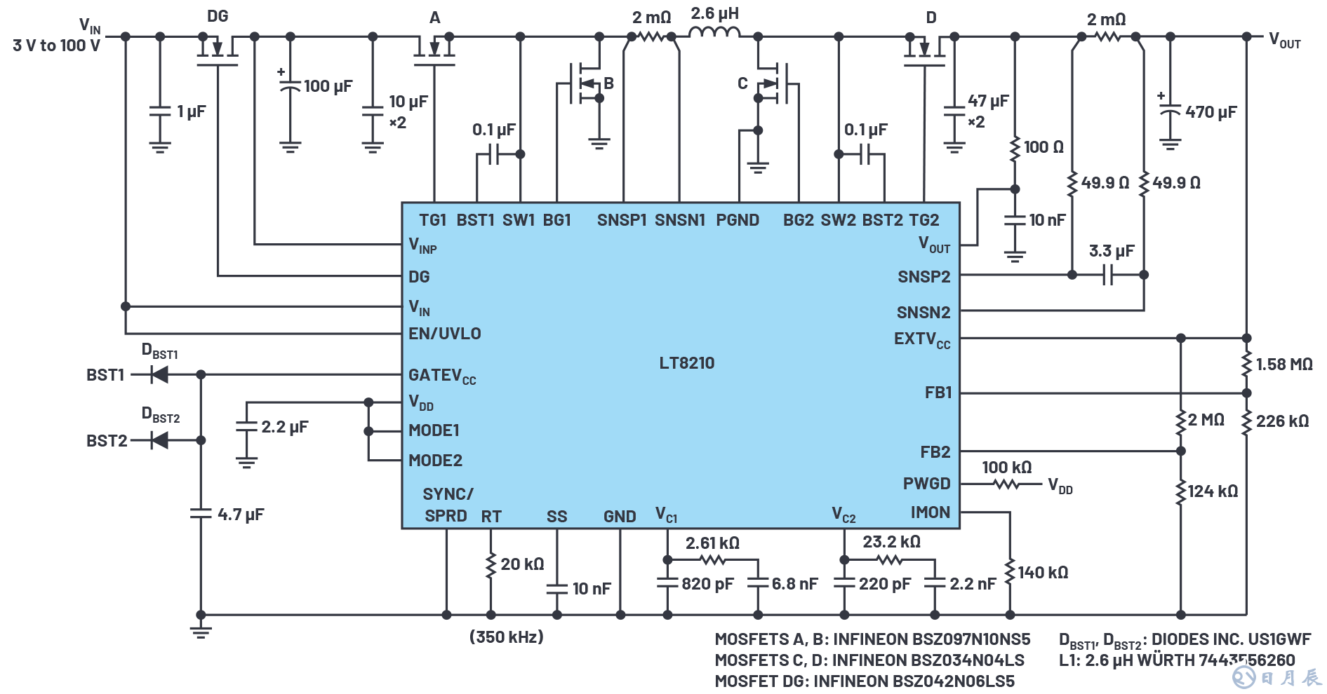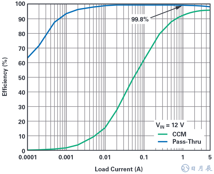 對于兩方面都想實現(xiàn)最佳效果的人來說,可以使用LT8210,它可以通過切換MODE1和MODE2引腳,在不同的工作模式之間切換。換句話說,LT8210在某些情況下可以作為具有固定輸出電壓(CCM、DCM,或Burst Mode™)的傳統(tǒng)的降壓-升壓穩(wěn)壓器運行,然后,在應用條件變化時,轉(zhuǎn)而采用帶通模式。對于常開系統(tǒng)和啟停應用而言,這個特性非常有用。