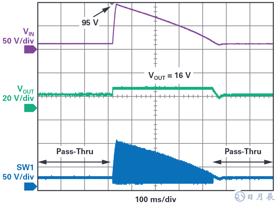 圖5.這個3 V至100 V 輸入降壓-升壓控制器以8 V至17 V帶通輸出運行。