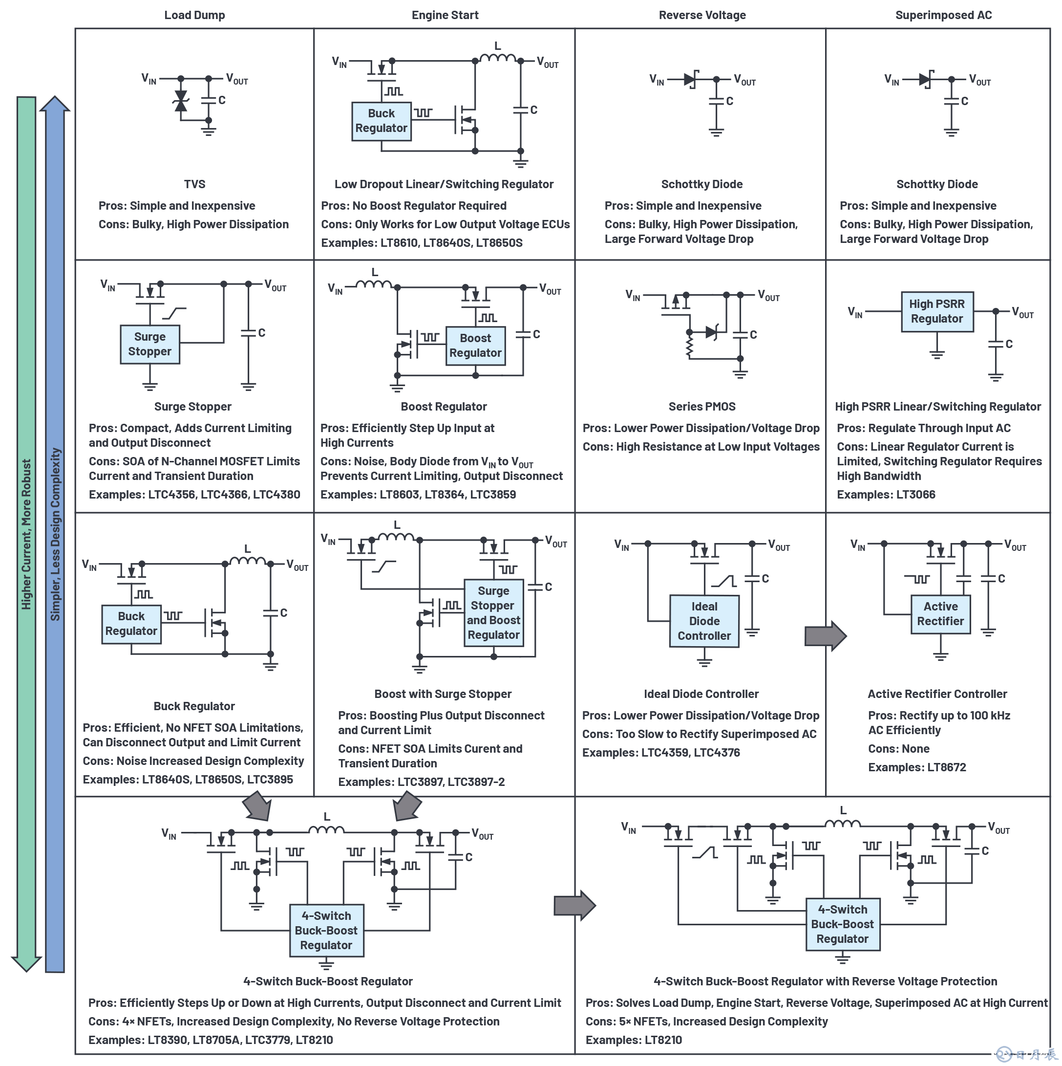 圖3匯總介紹了應對負載突降、反向輸入電壓、疊加交變電壓和發(fā)動機啟動工況測試的各種解決方案,以及各種方案的優(yōu)缺點??梢缘贸鰩讉€關(guān)鍵結(jié)論: