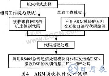 ARM通信處理模塊軟件設(shè)計(jì)主要包括五個(gè)部分:以太網(wǎng)通信處理模塊、代碼編輯模塊、信息顯示模塊、代碼提取處理模塊、RS485總線通信處理模塊。機(jī)床可設(shè)定兩種工作模式:組網(wǎng)工作模式和獨(dú)立工作模式,默認(rèn)情況下為組網(wǎng)工作模式。程序的設(shè)計(jì)包括操作系統(tǒng)和網(wǎng)絡(luò)協(xié)議棧的移植等,操作系統(tǒng)采用的uc/osII是一款簡(jiǎn)單、高效的嵌入式實(shí)時(shí)多任務(wù)操作系統(tǒng),該系統(tǒng)的源代碼公開(kāi),并具有良好可移植性和擴(kuò)展性,其穩(wěn)定性和可靠性已經(jīng)過(guò)實(shí)踐檢驗(yàn),非常適合應(yīng)用于控制系統(tǒng)領(lǐng)域。網(wǎng)絡(luò)協(xié)議棧采用LWIP,這是一套用于嵌入式系統(tǒng)的輕量級(jí)(light weight) TCP/IP協(xié)議棧,包括TCP、UDP、ICMP、IP、ARP、DHCP協(xié)議等,它和uc/osII構(gòu)成了ARM通信處理模塊軟件的設(shè)計(jì)主體。該軟件的具體流程如圖4所示。