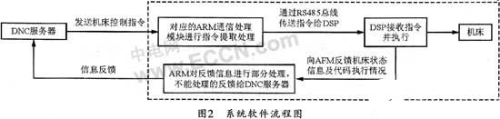 本系統(tǒng)的軟件設(shè)計(jì)主要有DNC服務(wù)器軟件設(shè)計(jì)、ARM通信處理模塊軟件設(shè)計(jì)、DSP控制模塊軟件設(shè)計(jì)等。其系統(tǒng)軟件流程如圖2所示。
