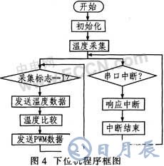 下位機(jī)程序框圖如圖4所示。系統(tǒng)上電后,下位機(jī)程序可使單片機(jī)不停地采集溫度,當(dāng)上位機(jī)向下位機(jī)發(fā)出命令置位采集標(biāo)志位時(shí),下位機(jī)采集的溫度送到上位機(jī)的面板并顯示,再將所采集的溫度數(shù)據(jù)同預(yù)先所設(shè)定的溫度值相比較,當(dāng)采集的溫度小于設(shè)定溫度時(shí),根據(jù)采集的溫度值跟設(shè)定溫度差值的大小,單片機(jī)的P10~P15引腳輸 出6路PWM,通過光電隔離TLP521-2和RC濾波電路控制可控硅模塊的輸入控制電壓,改變可控硅模塊的導(dǎo)通角,從而改變輸出功率。隨著采集到的溫度值越來越接近設(shè)定溫度值,單片機(jī)輸出的PWM值越來越大,導(dǎo)通角越來越小,輸出的功率也相應(yīng)變小,直到采集的溫度等于設(shè)定溫度時(shí),導(dǎo)通角完全關(guān)斷。同時(shí)下位機(jī)也可隨時(shí)響應(yīng)串口中斷,便于用戶通過上位機(jī)設(shè)置或修改設(shè)定溫度和控制范圍。