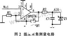 溫度采集測(cè)量部分采用高精度、重復(fù)性好、應(yīng)用廣泛的PT100作為采樣電阻;信號(hào)放大部分采用低功耗、低輸入失調(diào)電壓、線性好的OP07A;A/D模塊采用8051F350內(nèi)部的高速率24位A/D轉(zhuǎn)換器。溫度采集測(cè)量電路如圖2所示,圖中PT100是高精度溫度傳感器,Z1是