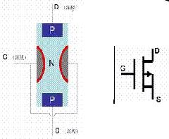 同樣用上述相同的方法在一塊摻雜濃度較低的N型半導體硅襯底上,用半導體光刻、擴散工藝制作兩個高摻雜濃度的P+區(qū),及上述相同的柵極制作過程,就制成為一個P溝道(PNP型)增強型MOS管。圖1-2所示A 、B分別是P溝道MOS管道結構圖和代表符號。