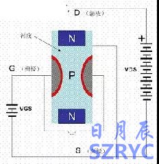 MOS管應用電壓的極性和我們普通的晶體三極管相同,N溝道的類似NPN晶體三極管,漏極D接正極,源極S接負極,柵極G正電壓時導電溝道建立,N溝道MOS管開始工作,如圖1-4-B所示。同樣P道的類似PNP晶體三極管,漏極D接負極,源極S接正極,柵極G負電壓時,導電溝道建立,P溝道MOS管開始工作,如圖1-5-B所示。