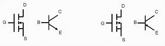 1).場效應管的源極S、柵極G、漏極D分別對應于三極管的發(fā)射極e、基極b、集電極c,它們的作用相似,圖1-6-A所示是N溝道MOS管和NPN型晶體三極管引腳,圖1-6-B所示是P溝道MOS管和PNP型晶體三極管引腳對應圖。