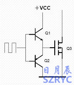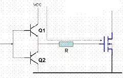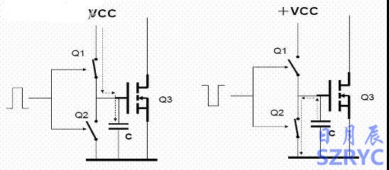 由于MOS管在制造工藝上柵極S的引線的電流容量有一定的限度,所以在Q1在飽和導通時VCC對MOS管柵極S的瞬時充電電流巨大,極易損壞MOS管的輸入端,為了保護MOS管的安全,在具體的電路中必須采取措施限制瞬時充電的電流值,在柵極充電的電路中串接一個適當?shù)某潆娤蘖麟娮鑂,如圖2-3-A所示。充電限流電阻R的阻值的選??;要根據(jù)MOS管的輸入電容的大小,激勵脈沖的頻率及灌流電路的VCC(VCC一般為12V)的大小決定一般在數(shù)十姆歐到一百歐姆之間。