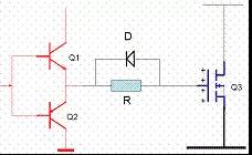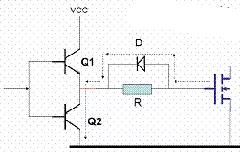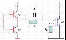 由于充電限流電阻的增加,使在激勵方波負半周時Q2導通時放電的速度受到限制(充電時是VCC產(chǎn)生電流,放電時是柵極所充的電壓VGS產(chǎn)生電流,VGS遠遠小于VCC,R的存在大大的降低了放電的速率)使MOS管的開關特性變壞,為了使R阻值在放電時不影響迅速放電的速率,在充電限流電阻R上并聯(lián)一個形成放電通路的二極管D,圖2-3-B所示。此二極管在放電時導通,在充電時反偏截止。這樣增加了充電限流電阻和放電二極管后,既保證了MOS管的安全,又保證了MOS管,“開”與“關”的迅速動作。