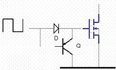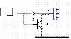 圖中 D為充電二極管,Q為放電三極管(PNP)。工作過程是這樣,當激勵方波正半周時,D導通,對MOS管輸入端等效電容充電(此時Q截止),在當激勵方波負半周時,D截止,Q導通,MOS管柵極S所充電荷,通過Q放電,MOS管完成“開”與“關”的動作,如圖2-4-B所示。此電路由激勵信號直接“灌流”,激勵信號源要求內阻較低。該電路一般應用在功率較小的開關電源上。