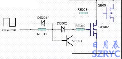 從等效電路圖來分析,集成電路的激勵輸出端(PFCOUTPUT端子),輸出方波的正半周時DE002導通,經(jīng)過RE008、RE010對MOS開關管QE001和QE002的柵極充電,當激勵端為負半周時,DE002截止,由于晶體三極管VE001是PNP型,負半周信號致使VE001導通,此時;QE001和QE002的柵極所充電荷經(jīng)過VE001放電,MOS管完成“開”、“關”周期的工作。從圖3-5的分析中,RE011作用是充電的限流電阻,而在放電時由于VE001的存在和導通,已經(jīng)建立了放電的回路,DE003的作用是加速VE001的導通,開關管關閉更加迅速。