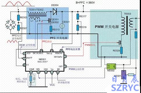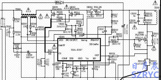 海信液晶電視32寸~46寸均采用該開關電源,電源采用了復合集成電路SMA—E1017(PFC和PWM共用一塊復合激勵集成電路),同樣該PFC開關電源部分也是一個并聯(lián)的開關電源,圖3-4所示。TE001是儲能電感、DE004是開關電源的整流管、QE001、QE002是兩只并聯(lián)的大功率MOS開關管。該集成電路的PFCOUTPUT端子是激勵輸出,,RE008、RE009、RE010、VE001、DE002、RE011、DE003組成QE001和QE002的灌流電路。