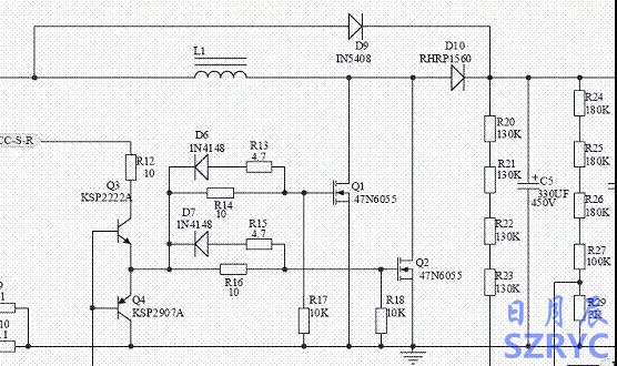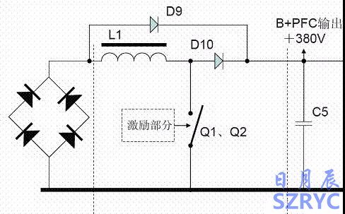 圖3-1所示;是三星V2屏等離子開關電源的PFC激勵部分。從圖中可以看出;這是一個并聯(lián)開關電源L1是儲能電感,D10是這個開關電源的整流二極管,Q1、Q2是開關管,為了保證PFC開關電源有足夠的功率輸出,采用了兩只MOS管Q1、Q2并聯(lián)應用(圖3-2所示;是該并聯(lián)開關電源等效電路圖,圖中可以看出該并聯(lián)開關電源是加在整流橋堆和濾波電容C5之間的),圖中Q3、Q4是灌流激勵管,Q3、Q4的基極輸入開關激勵信號, VCC-S-R是Q3、Q4的VCC供電(22.5V)。兩只開關管Q1、Q2的柵極分別有各自的充電限流電阻和放電二極管,R16是Q2的在激烈信號為正半周時的對Q2柵極等效電容充電的限流電阻,D7是Q2在激烈信號為負半周時的Q2柵極等效電容放電的放電二極管,同樣R14、D6則是Q1的充電限流電阻和放電的放電二極管。R17和R18是Q1和Q2的關機柵極電荷泄放電阻。D9是開機瞬間浪涌電流分流二極管。