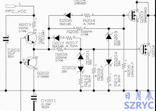 圖3-3所示;是三星V4屏開關電源PFC激勵部分電原理圖,可以看出該V4屏電路激勵部分原理相同于V2屏。只是在每一只大功率MOS開關管的柵極泄放電阻(R209、R206)上又并聯(lián)了過壓保護二極管;ZD202、ZD201及ZD204、ZD203