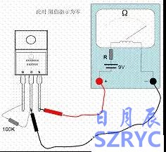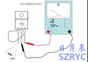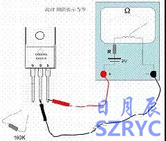 保持上述狀態(tài);此時用一只100K~200K電阻連接于柵極和漏極,如圖5-4所示;這時表針指示歐姆數(shù)應該越小越好,一般能指示到0歐姆,這時是正電荷通過100K電阻對MOS管的柵極充電,產(chǎn)生柵極電場,由于電場產(chǎn)生導致導電溝道致使漏極和源極導通,所以萬用表指針偏轉,偏轉的角度大(歐姆指數(shù)小)證明放電性能好。