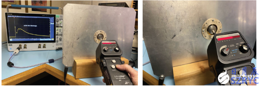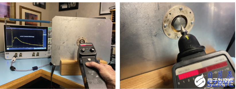 在實(shí)際檢驗(yàn)測(cè)試過(guò)程中,仿真器地線應(yīng)盡量遠(yuǎn)離示波器同軸電纜,防止電纜到電纜耦合。標(biāo)準(zhǔn)推薦抓住中間的地線,從地面上拉開(kāi)。觸點(diǎn)放電尖端要一直位于靶的中心(圖6)。