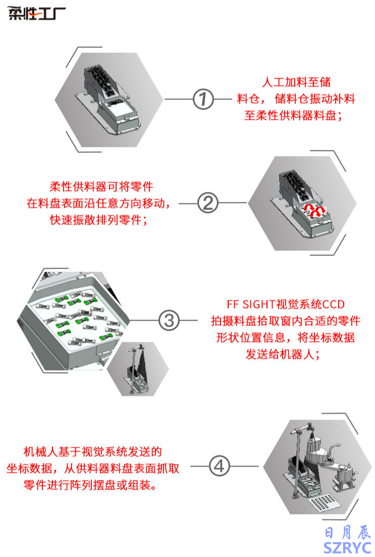 2.然后柔性供料器可將零件在料盤表面沿任意方向移動,快速振散排列零件;