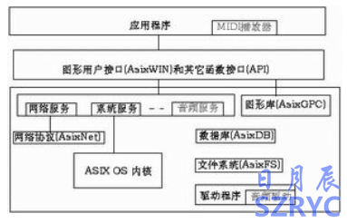 該手持信息終端是以自主研發(fā)的多任務(wù)嵌入式操作系統(tǒng)AsixOS為基礎(chǔ),包括操作系統(tǒng)(Asix OS)、驅(qū)動程序包(Driver)、應(yīng)用程序包(Application)、圖形用戶接口(AsixWIN)、圖形庫軟件包(AsixGPC)、嵌入式數(shù)據(jù)庫(AsixDB)、嵌入式文件系統(tǒng)(AsixFS)、網(wǎng)絡(luò)協(xié)議軟件包(Asixnet)等等。Asix模塊原理框圖如圖3所示。