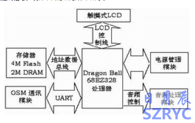 該手持信息終端平臺采用的是業(yè)界流行的Motorola公司的MC68EZ328處理器;存儲模塊由4M字節(jié)的Flash閃存和2M字節(jié)的EDO DRAM組成;顯示模塊采用160×240的16級灰度的黑白屏,屏上合成有四線電阻式觸摸屏。音頻處理模塊的作用是用來播放音樂,它由兩部分構(gòu)成:濾波電路和音頻功率放大電路。該模塊接受來自處理器內(nèi)部輸出的PWM脈沖信號和音頻模塊的開啟關(guān)閉的控制信號。硬件平臺的結(jié)構(gòu)如圖2所示。