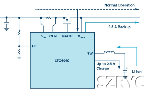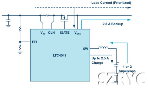 圖2.LTC4041超級電容備用電源應(yīng)用原理圖。