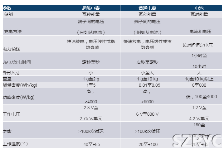 表1.超級電容與普通電容和電池的特性比較