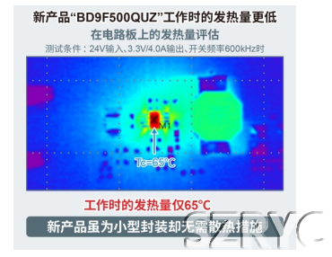 BD9F500QUZ雖然采用的是不利于散熱的小型封裝,而且還支持高速開關(guān),但仍然能夠以很低的發(fā)熱量工作。在具有同等功能的小尺寸產(chǎn)品中,IC溫度接近100℃,因此需要采取散熱措施(通過外置散熱器和MOSFET來分散熱量),而ROHM新產(chǎn)品的工作效率高達(dá)90%(輸出電流為3A時),并采用散熱性能出色的封裝,工作時的發(fā)熱溫度僅為65℃左右,因此客戶無需采取散熱措施,從而有助于提高應(yīng)用的可靠性。