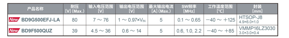 “BD9G500EFJ-LA”適用于48V電源系統(tǒng),具有業(yè)內(nèi)超高的80V耐壓,同時由于其內(nèi)置MOSFET,可實現(xiàn)同類產(chǎn)品中高達(dá)5A的輸出電流,且支持大功率,從而有助于5G通信基站和充電樁等設(shè)備實現(xiàn)更高可靠性和性能。而“BD9F500QUZ”則適用于24V電源系統(tǒng),采用小型薄型封裝(3.0mm×3.0mm×0.4mm),雖然小巧卻實現(xiàn)了39V的耐壓和5A的輸出電流,有助于以FA設(shè)備為首的眾多先進(jìn)工業(yè)設(shè)備實現(xiàn)更高性能和更小體積。