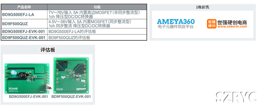 新產(chǎn)品已于2021年5月開始暫以月產(chǎn)10萬個的規(guī)模投入量產(chǎn)(樣品價格 500日元/個,不含稅)。新產(chǎn)品和評估板“BD9G500EFJ-EVK-001”和“BD9F500QUZ-EVK-001”已經(jīng)開始通過電商進(jìn)行銷售,從AMEYA360、SEKORM等電商平臺均可購買。