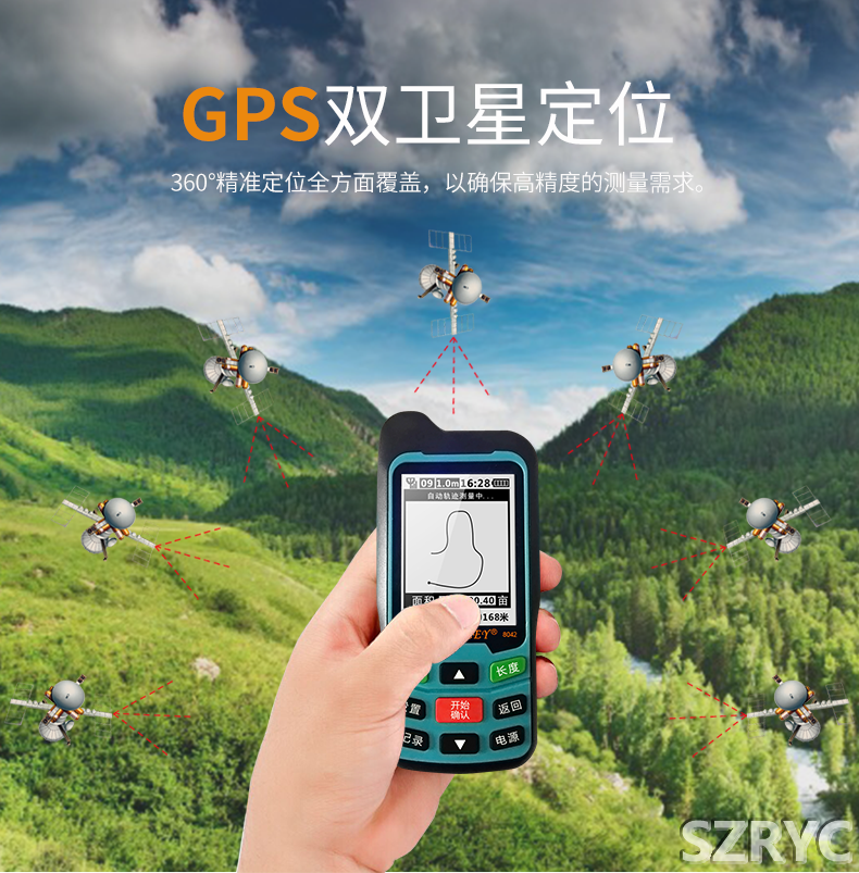 測量畝儀采用GPS全球衛(wèi)星定位系統(tǒng),可提供實(shí)時的經(jīng)過度、緯度、高度等導(dǎo)航和定位信息,利用GPS定位功能,獲得各點(diǎn)坐標(biāo),數(shù)學(xué)方法計算距離、面積等數(shù)據(jù)。
