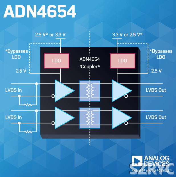 ADN4624可在惡劣環(huán)境中提供簡單連接、魯棒隔離和數(shù)據(jù)完整性。該新型iCoupler數(shù)字隔離器在單個小尺寸器件中提供高達10Gbps的總帶寬,可在全速下實現(xiàn)高速串行LVDS或CML的直接隔離,消除了解串行化的復(fù)雜性。ADN4624能夠在超低抖動下實現(xiàn)精密時序,以提供完整的ADC性能和分辨率,包括精密ADC采樣時鐘。