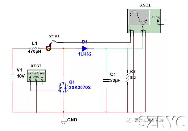 我們對(duì)上圖中的boost進(jìn)行仿真,分別對(duì)比470uH和100uH時(shí)的紋波,示波器中綠色的是輸出電壓,紅色的是電感電流。