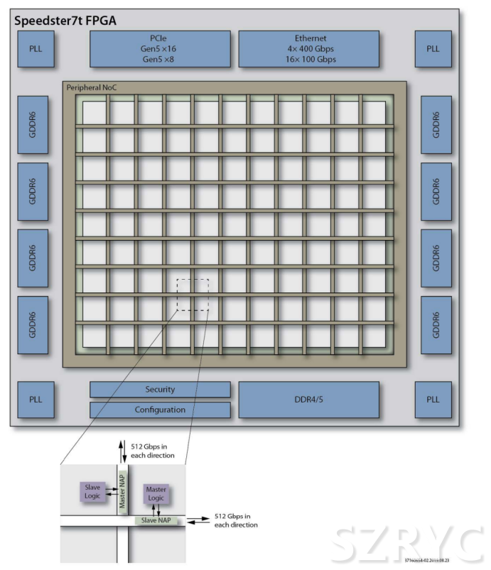 Speedster7t架構(gòu)中的2D NoC提供了從邏輯陣列的可編程邏輯到位于I/O環(huán)中的高速接口子系統(tǒng)的高帶寬連接,用于連接到片外資源。它們包括用于高速存儲訪問的GDDR6和諸如PCIe Gen5和400G以太網(wǎng)等片內(nèi)互連協(xié)議。這種結(jié)構(gòu)支持構(gòu)建高度并行化的架構(gòu),以及基于中央FPGA的高度數(shù)據(jù)優(yōu)化的加速器。