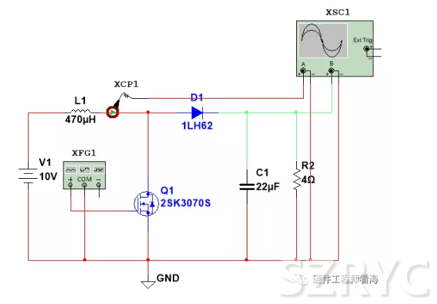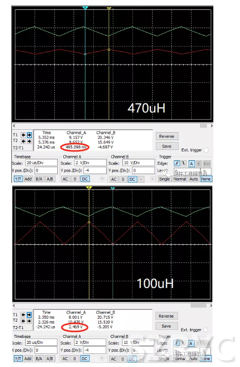 我們對上圖中的boost進行仿真,分別對比470uH和100uH時的紋波,示波器中綠色的是輸出電壓,紅色的是電感電流。