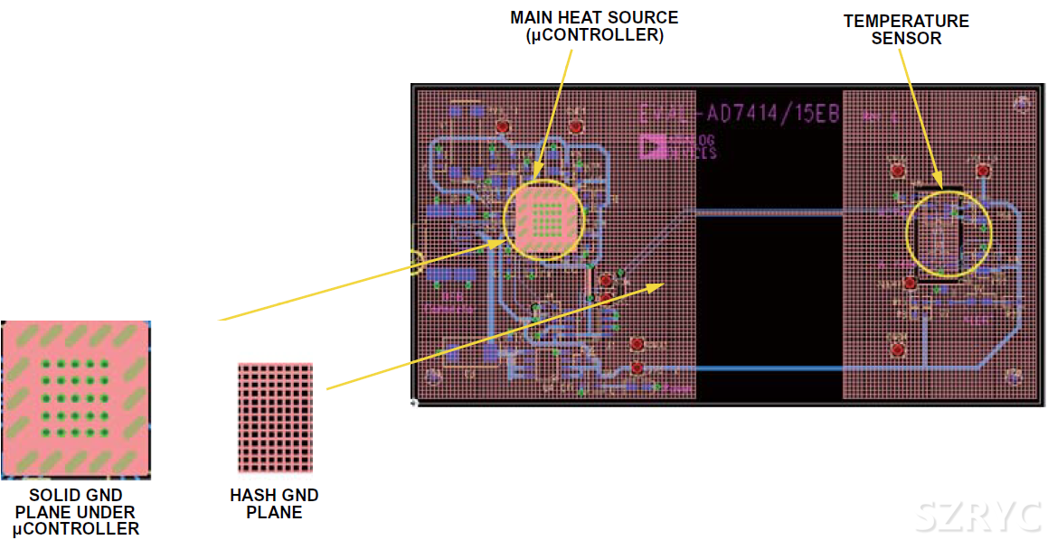 為此,需要注意防止主要熱源的散熱對(duì)溫度傳感器產(chǎn)生影響,以精確地監(jiān)測(cè)環(huán)境溫度,主要的設(shè)計(jì)要點(diǎn)包括:使用散列接地平面,減少接地平面的面積來增加熱阻,同時(shí)使用窄的接地連接來增加熱阻;溫度傳感器盡可能地遠(yuǎn)離熱源;為溫度傳感器提供單獨(dú)的接地平面,盡量減少與主接地平面的連接;主熱源下面使用實(shí)心接地平面,并露出綠色阻焊膜,這樣可使主熱源散熱的熱阻最低。