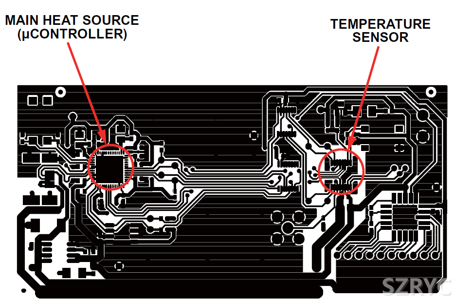 要實(shí)現(xiàn)對(duì)關(guān)鍵熱源溫度的真實(shí)有效測(cè)試,根據(jù)熱傳導(dǎo)的原理,溫度傳感器和熱源之間的熱阻最小,傳感器與熱源盡量靠近可以確保最實(shí)時(shí)、準(zhǔn)確反應(yīng)熱源溫度。此外,PCB熱量的60%至65%通過引腳傳遞到芯片熱傳感器。接地引腳連接到基板,因此,接地引腳與溫度傳感器和熱源之間的熱阻應(yīng)用盡量小。
