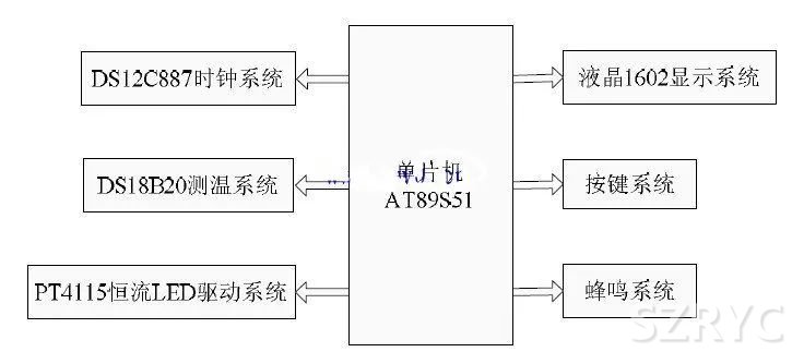 該多功能 LED 臺(tái)燈系統(tǒng)采用20 只5mm 高亮白光LED 燈珠為光源,以AT89S51 單片機(jī)為主控芯片,由LED 恒流驅(qū)動(dòng)系統(tǒng)、時(shí)鐘系統(tǒng)、測溫系統(tǒng)、液晶顯示系統(tǒng)、蜂鳴系統(tǒng)、按鍵系統(tǒng)組成。系統(tǒng)結(jié)構(gòu)框圖如圖1 所示。